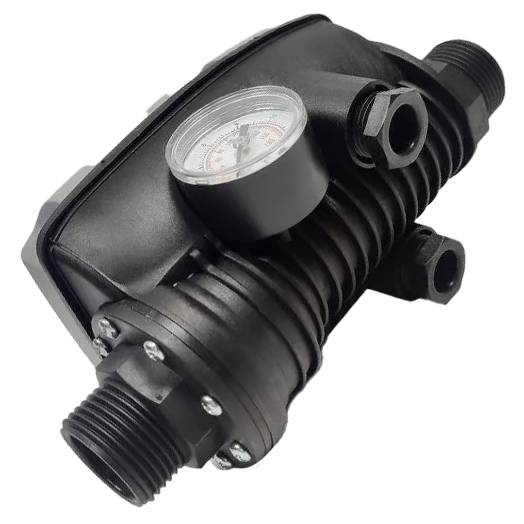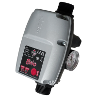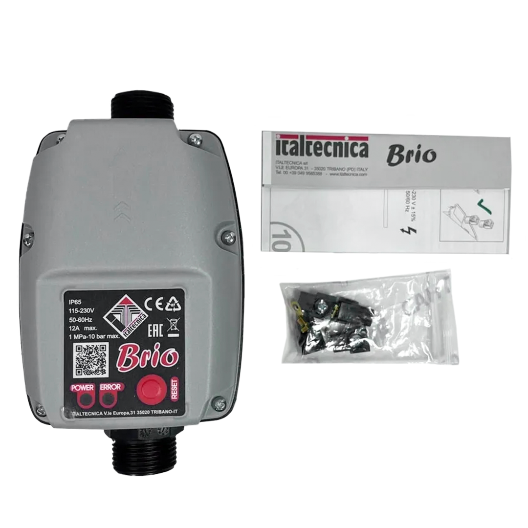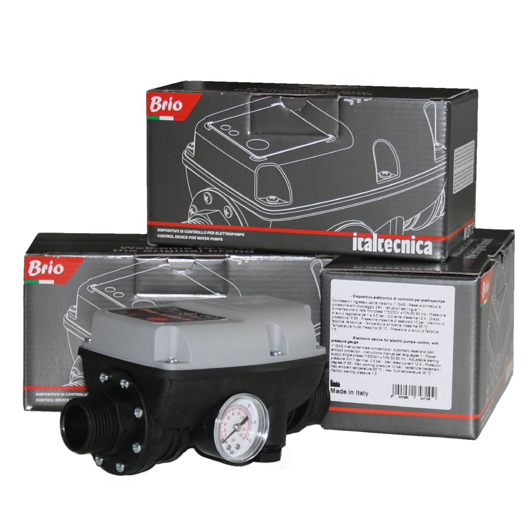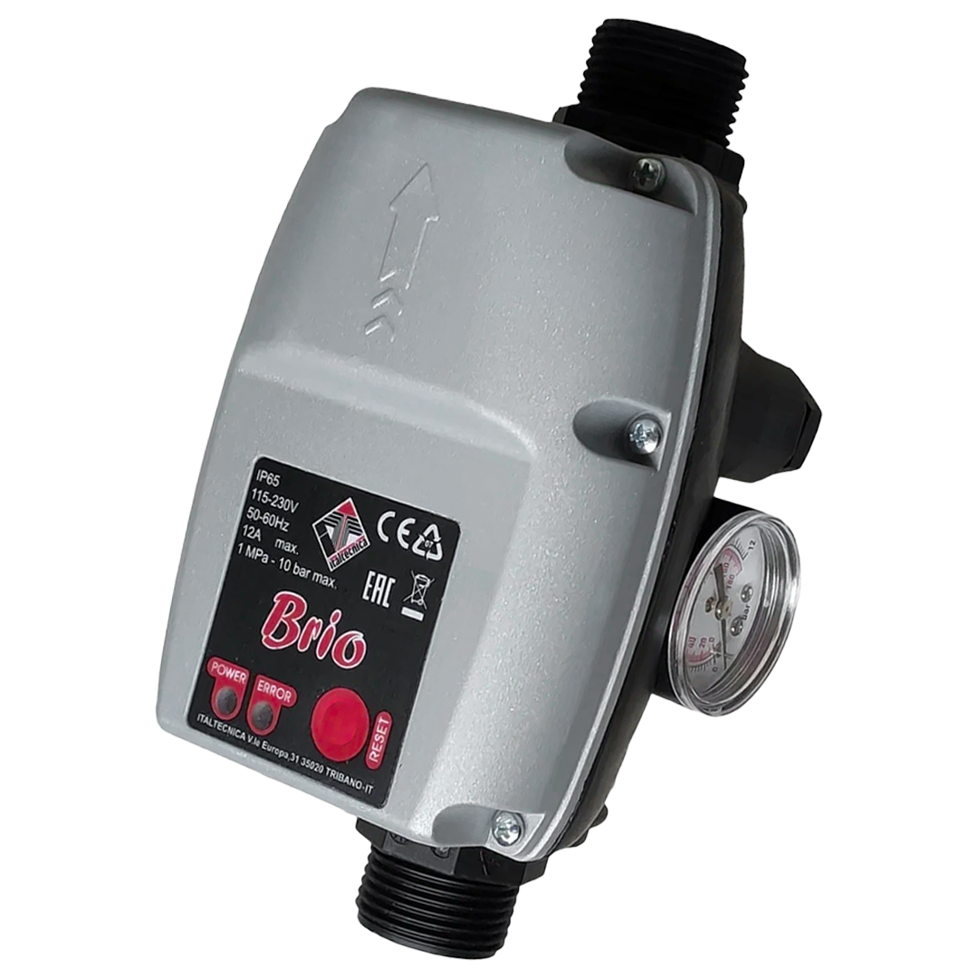 Реле давления Italtecnica BRIO2000 применяется для автоматического включения и выключения однофазных электронасосов мощностью до 2 л.с. Полностью заменяет традиционно используемые автоматические станции водоснабжения, состоящие из реле давления и гидроаккумулятора. Включает электронасос после падения давления в системе (открытые краны) и выключает его, когда прерывается поток воды при максимальном значении давления для электрического насоса (краны закрыты). Кнопка RESET (сброс) 2. Индикатор остановки (сухой ход) 3. Индикатор напряжения сети 4. Клеммы подключения насоса 5. Винт для регулировки давления срабатывания 6. Вход с резьбовым соединением 1" резьба="" наружная="" предзаказу="" внутренняя="" вращающая="" Подключения="null" питания="" Выход="null" с="" резьбовым="" соединением="" Манометр="null" в="" версии="">