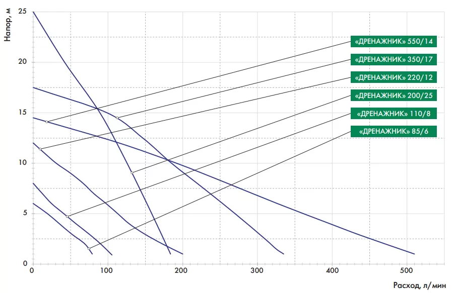 Графические характеристики дренажного насоса ДЖИЛЕКС ДРЕНАЖНИК 550/14