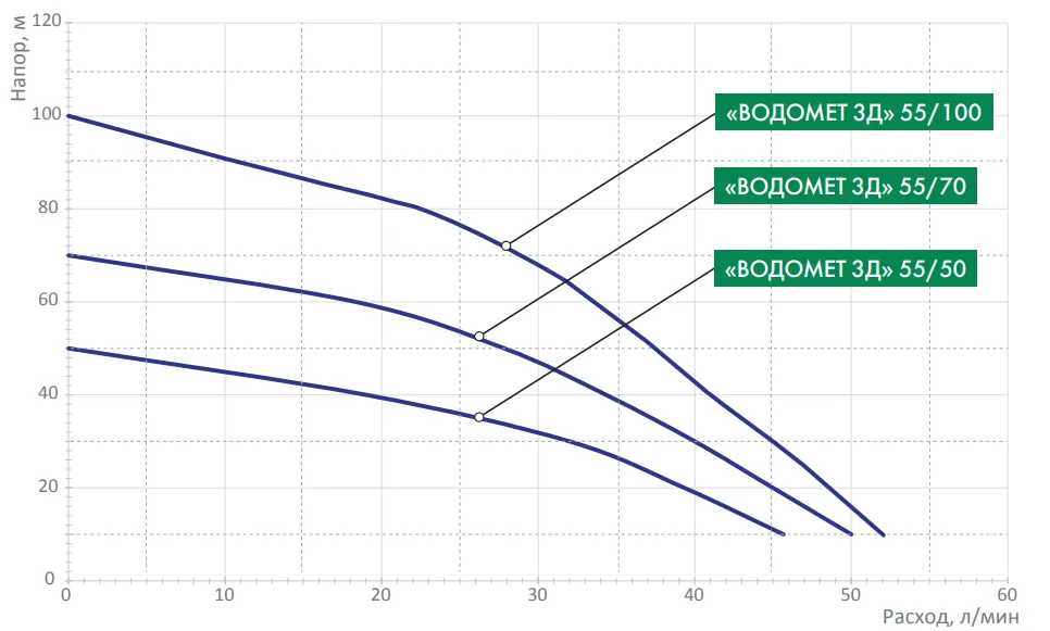 Насос ДЖИЛЕКС ВОДОМЕТ 3Д 55/70 предназначены для подачи чистой воды из скважин, колодцев, резервуаров и открытых водоемов, комплектации систем автоматизированного водоснабжения, полива и орошения.Графические характеристики насоса