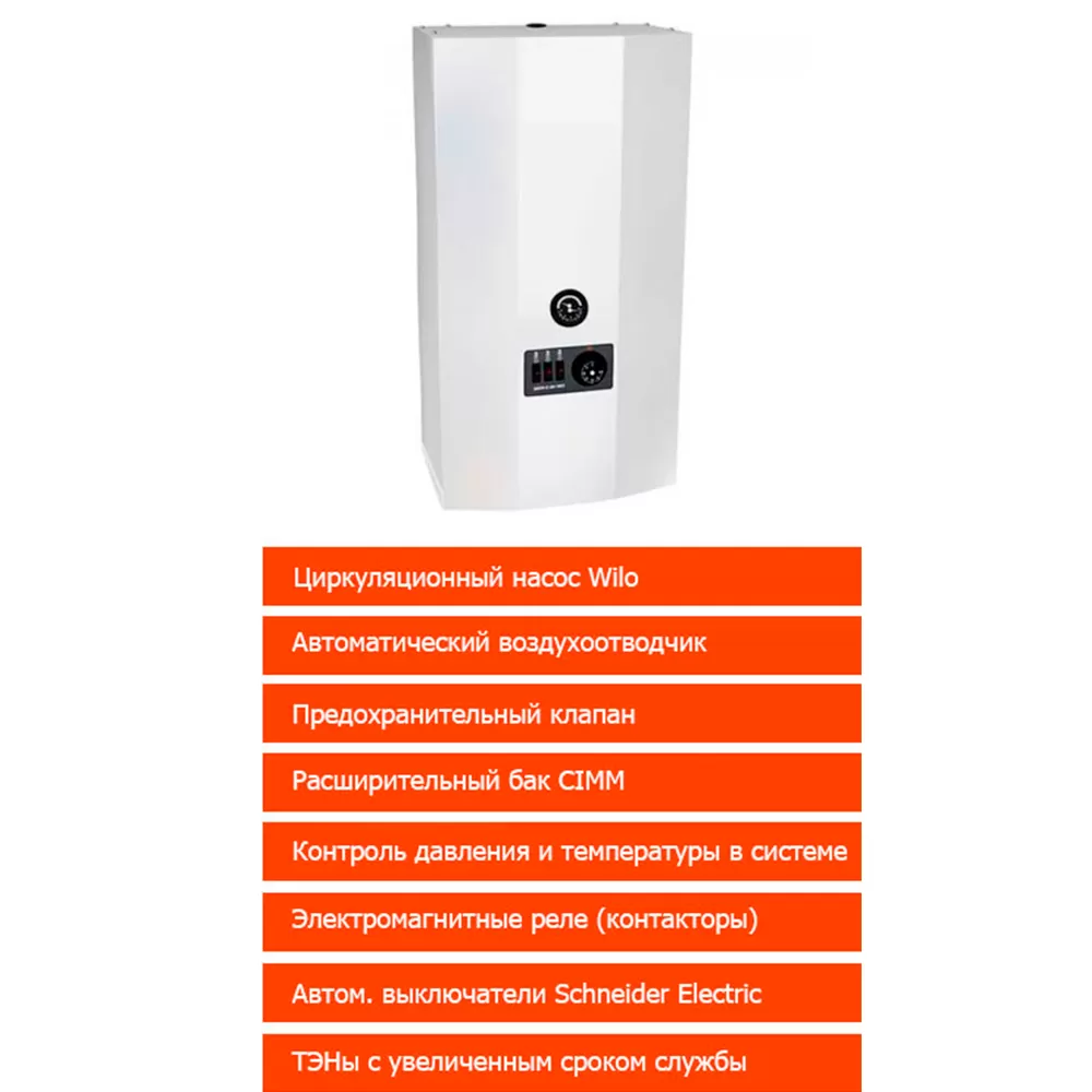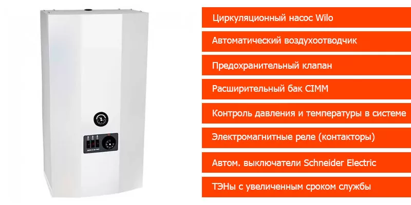 Котёл идеален для обогрева небольших дачных домиков, не подключенных к газовой магистрали. Также он применяется в зданиях промышленного, хозяйственного и коммерческого назначения. Он прост в управлении, не требует частого обслуживания, обладает продолжительным сроком службы за счёт износостойких ТЭНов. К тому же он не требует покупки дополнительного оборудования – на борту представлены насос, расширительный бак и предохранительный клапан.