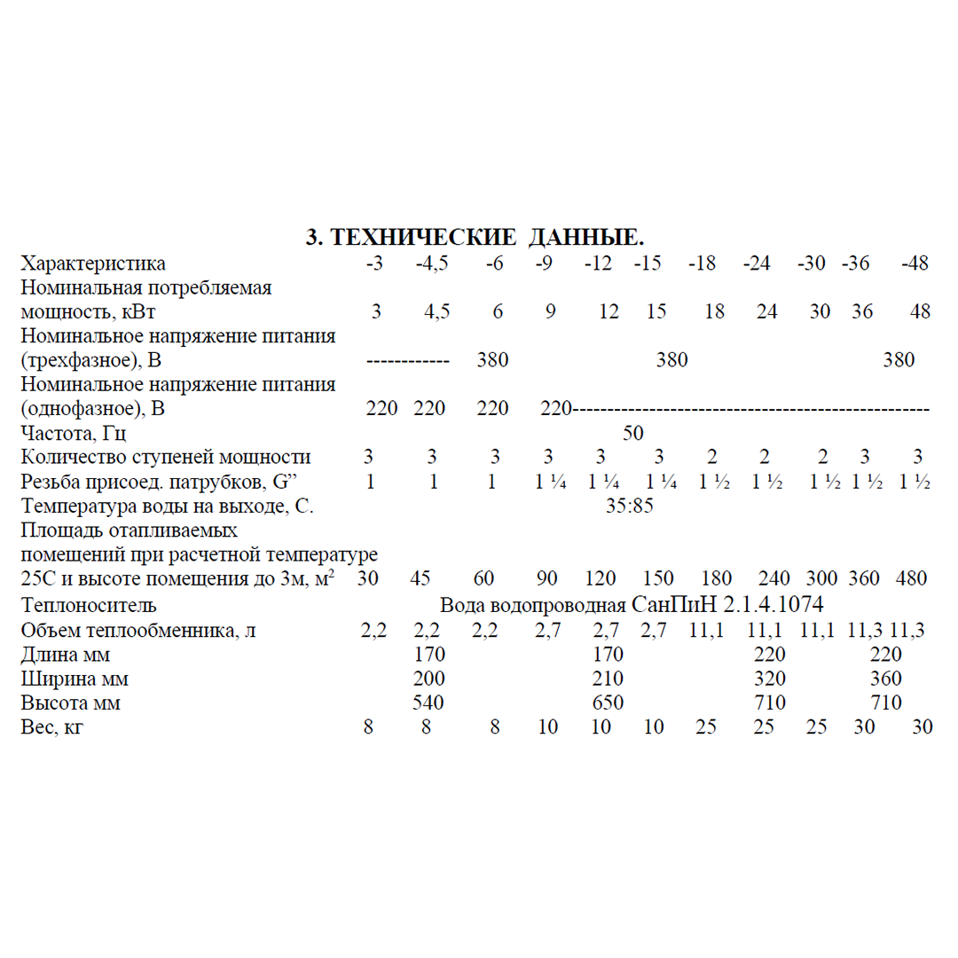 Ступенчатая регулировка мощности: Блок ТЭНов сконфигурирован по схеме 3+3+3 кВт, что позволяет гибко управлять потреблением электроэнергии и подстраивать работу под текущие потребности в тепле.