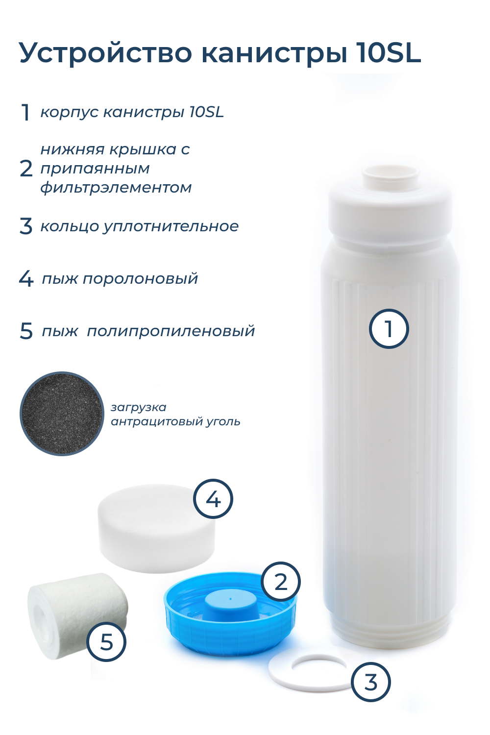 Универсальность: Совместим со стандартными бытовыми фильтр-системами 10SL большинства производителей (таких как Аквафор, Барьер, Гейзер и др.) в качестве второй ступени фильтрации.