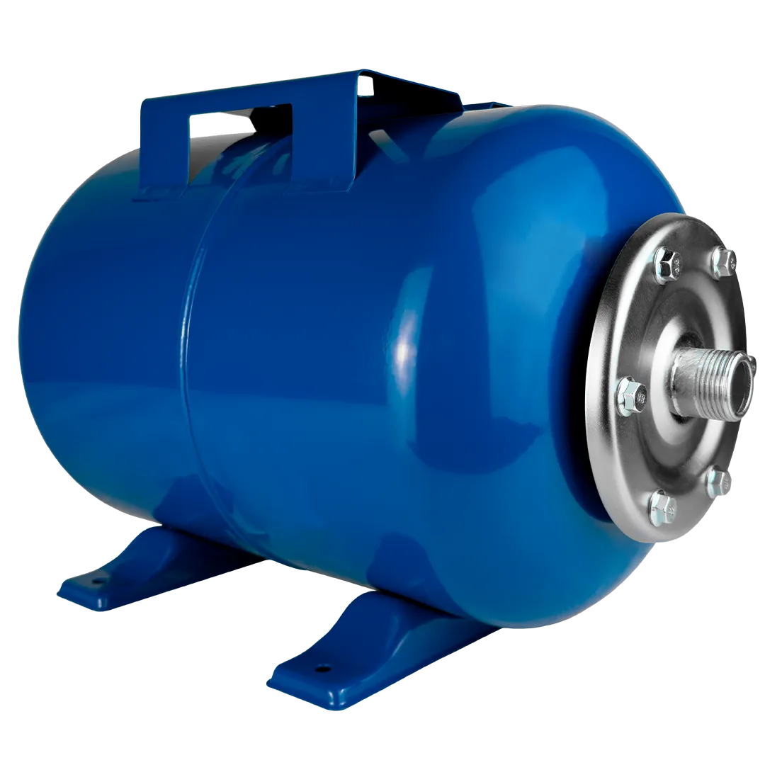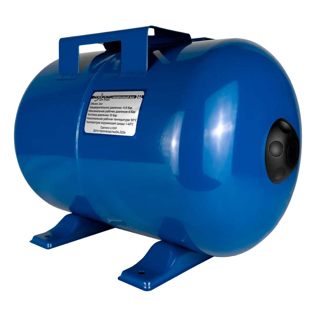 Гидроаккумулятор для воды MAXPUMP H-24 горизонтального исполнения предназначен для систем холодного водоснабжения. Гидроаккумулятор служит для накапливания запаса воды объемом до 24 литров, снижения вероятности возникновения гидравлических ударов в системе, а также сокращения количества пусков насоса, тем самым продлевая срок службы насоса. Конструкция гидроаккумулятора представляет собой стальной корпус, окрашенный в зеленый цвет, со сменной мембранной, изготовленной из высококачественного материала EPDM, опорными ножками у основания бака, воздушным клапаном и площадкой для установки насоса. Горизонтальные гидроаккумуляторы, благодаря установочной площадке, расположенной на поверхности бака, могут использоваться с поверхностными насосами.