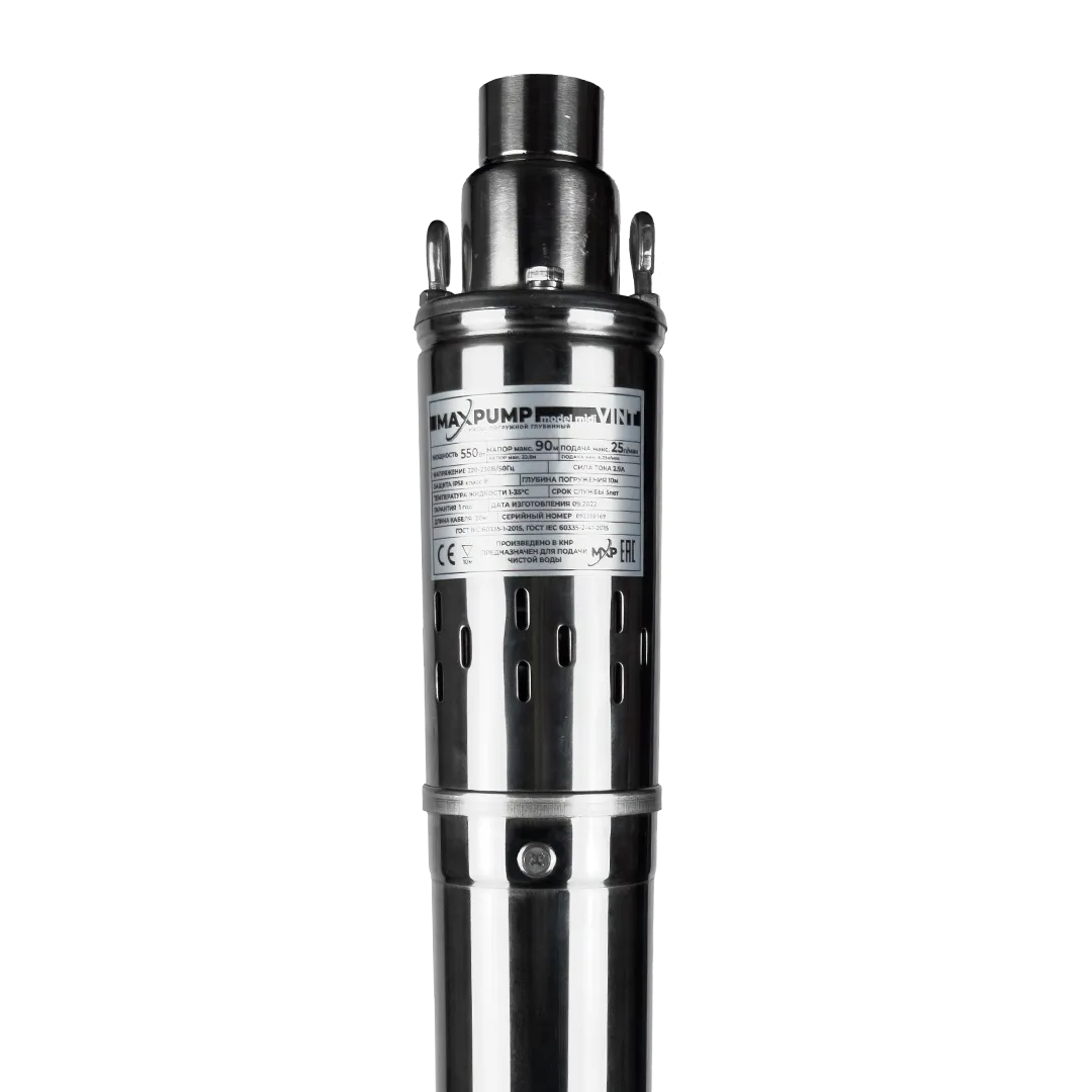 Винтовой скважинный насос MAXPUMP midiVINT насос имеет встроенный в корпусе пусковой конденсатор. Диаметр насоса идеально подходит для скважин 90мм и может использоваться в скважинах до 125мм. Насос отлично подойдет для водоснабжения односемейного дома, максимальный напор насоса составляет 75 м, а производительность 1.5 м³/час. Двигатель насоса обладает мощностью 550 Вт, матерьял обмотки двигателя медь. Корпус насоса выполнен из нержавеющей стали. Насос укомплектован с завода кабелем 20 м. Конструкция насоса проста и легка в обслуживании. Внутри насоса нет привычного вала, на который насажены крыльчатки, разгоняющие питьевую воду для подачи вверх по трубе. Конструкция здесь больше напоминает обычное сверло – шнек, которое при вращении придает жидкости ускорение.