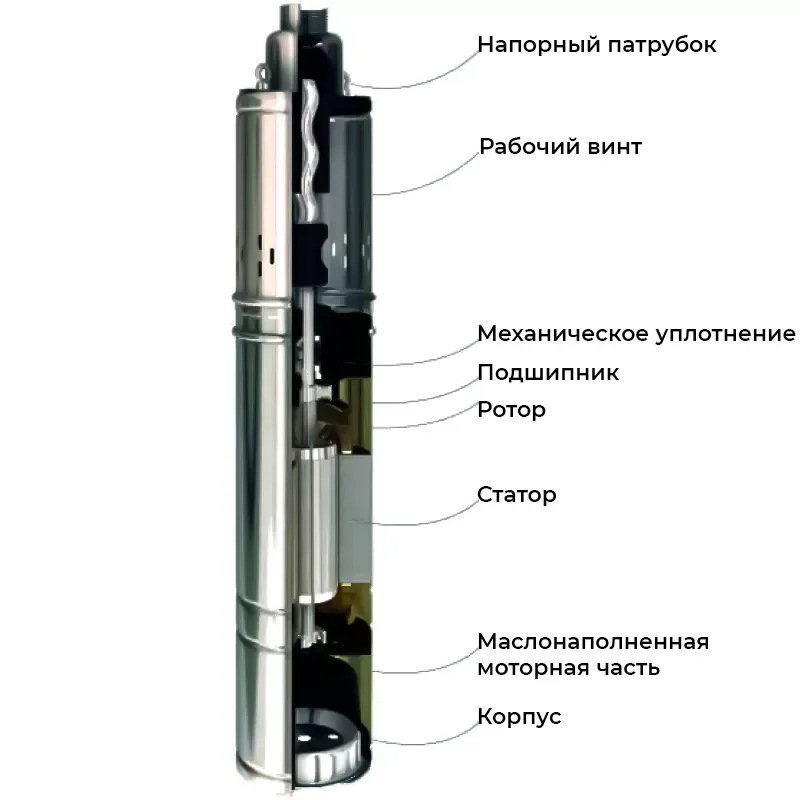 - Двигатель находится в масляной ванне для лучшего охлаждения и защиты от воды