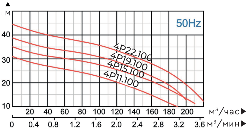 - Пропуск частиц: до 50 мм, что позволяет насосу работать с загрязнённой водой, содержащей крупные твёрдые включения.