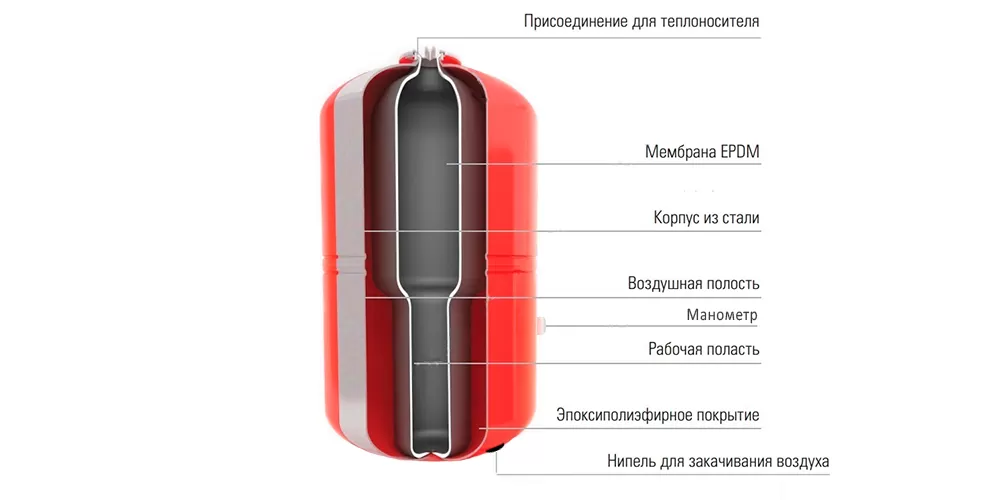 Расширительный бак Wester WRV 750 предназначен для компенсации температурного расширения теплоносителя в замкнутых системах отопления. Корпус гидроаккумулятора выполняется из углеродистой стали с эпоксиполиполиэфирным наружным покрытием красного цвета RAL 3020. Сменная мембрана изготавливается из высококачественного материала EPDM, обладающим благоприятными механическими свойствами и очень широким температурным диапазоном применения, что позволяет использовать ее для горячей воды. В качестве теплоносителя допускается использование воды или водного раствора гликоля с концентрацией до 50%. Баки снабжены рабочими штуцерами для подключения к системе отопления диаметром 2". Максимальное рабочее давление для данной модели составляет 10 бар. Мембранный бак для отопления WRV 750 оснащен держателем мембраны, к которому можно подключить манометр. Также модель имеет специальные стойки у основания бака для установки в вертикальном положении.