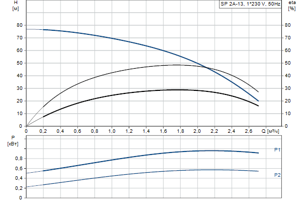 Насос Grundfos SP 2A-13 создан с применением новейших гидравлических технологий. Grundfos SP 2A-13 созданные специально для того, чтобы обеспечивать максимальную эффективность в периоды высокой нагрузки, насос имеет низкую стоимость и высокую надёжность эксплуатации вне зависимости от вида назначения. Grundfos SP 2A-13 обеспечивает высокую эффективность, высокое сопротивление абразивному износу (песку и иным абразивам), защиту от перегрева двигателя и простоту технического обслуживания. Также доступна готовая к применению система контроля и управления, предназначенная для постоянной оптимизации работы насосной системы. Максимальная производительность насоса 2.6 м3/час, максимальный напор 78 м при мощности электродвигателя 550 Вт. Насос работает от сети 220 в. Гарантийный срок на насос Grundfos SP 2A-13 составляет 2 года.