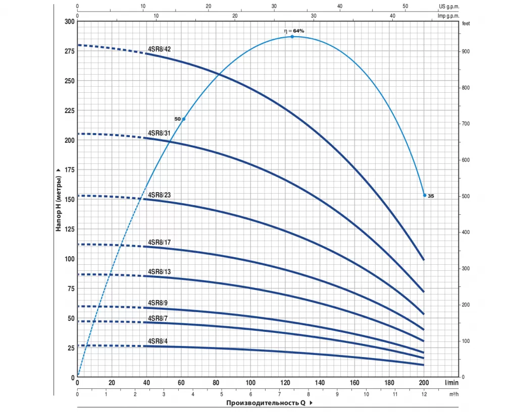 Глубинный насос Pedrollo 4SR8/17-P, отличается объективной ценой и надежной работой всех исполнительных механизмов. Насос Pedrollo 4SR8/17-P достаточно простой в эксплуатации и обслуживании, поэтому отлично подходит как для домашнего, так и промышленного применения.В основе работы Pedrollo 4SR8/17-P лежит конструктивно простой, но функционально успешный многоступенчатый центробежный принцип. Электрический двигатель подключается к агрегату через суппорт, в соответствии с нормативами международного стандарта NEMA. Мощность электродвигателя насоса составляет 3000 Вт . И при таких показателях мощности насос обладает максимальным напором в 112 метров и максимальной производительностью 12 м3/час. Функционирование Pedrollo 4SR8/17-P идентично большинству устройств, основанных на центробежных механизмах подачи воды. Жидкость втягивается в корпус устройства благодаря центробежной силе, создаваемой рабочими колесами, которые также проталкивают воду через все тело насоса "диаметр насоса 4"", а затем в нагнетающий патрубок "диаметр патрубка 2"", через который вода и попадает к конечному потребителю. Главной особенностью насоса Pedrollo 4SR8/17-P является малый диаметр корпуса агрегата, а также то, что перекачиваемая вода не касается стенок двигателя. Между жидкостью и корпусом движущей установки располагается прослойка из технологического масла, которая и предотвращает попадание мелких частиц непосредственно в исполнительный механизм. В то время как охлаждение электропривода происходит за счет верхнего способа забора воды, т.е. перекачиваемая жидкость находится всегда выше уровня расположения двигателя. Насос питается от сети в 380 в и комплектуется кабелем 1.5 метров.